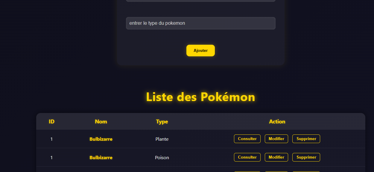 PokeapiCette api réaliser au cours de la periode de formation est developper avec Javascript ainsi que node.js. Elle permet de consulter une liste de pokemon d’en ajouter de les modifier ou supprimer Voir l'api ici